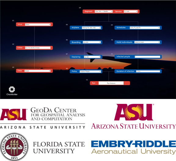 Results: The Chainbuilder team has worked closely with others at Arizona State University, Florida State University, and Embry-Riddle Aeronautical University to develop the a fine-scale model that tracks individual passenger movement in airplanes, based on social dynamics and empirically observed passenger behavioral characteristics. Sources of uncertainty are parameterized, and simulations performed to cover the range of uncertainties. Results from individual flights are linked with genetic information in a phylo-geographic model in order to evaluate the likelihood of epidemics and to identify pathways for the spread of diseases. The analysis is also validated with empirical data in order to ensure that guidance offered by this analysis is likely to be realistic. The model will help achieve VIPRA’s goal of deploying a comprehensive and accurate decision-support infrastructure that can be used eliminate the threat of any new outbreak of an epidemic.